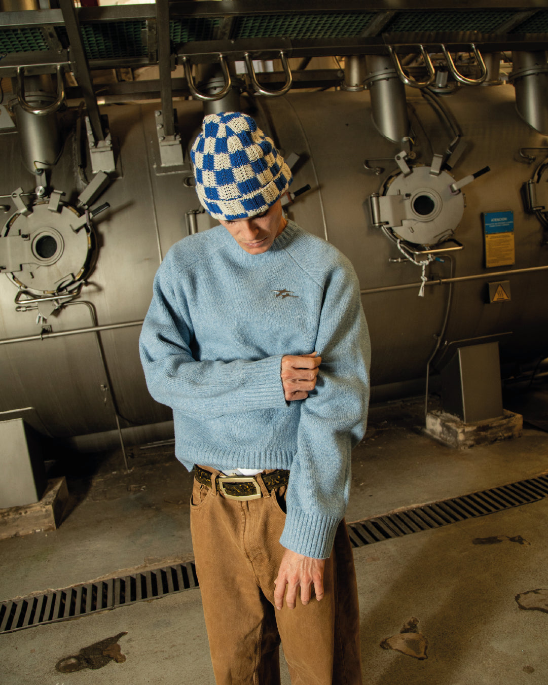 Wide sleeves, metal logo pin — subtle but distinct